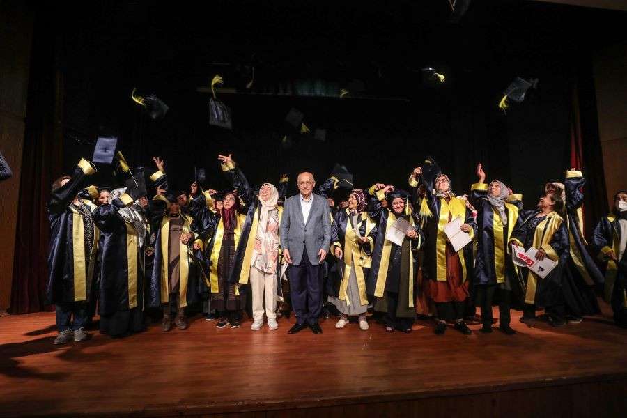 2022-2023 eğitim dönemini başarıyla tamamlayarak okuma-yazma öğrenen 70 kadın Yenimahalle Belediyesi Dört Mevsim Tiyatro Salonu’nda gerçekleştirilen mezuniyet töreninde önce kep attı sonra bowling oynadı.