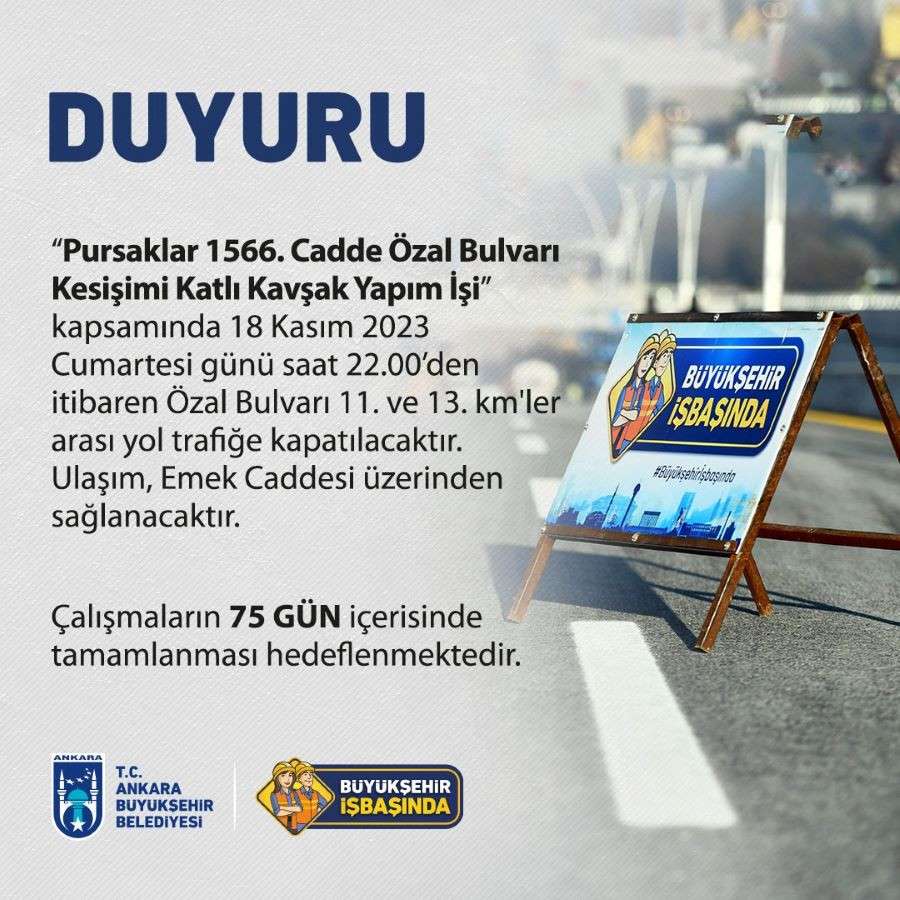 Pursaklar trafiğine nefes aldıracak proje kapsamında, 1566. Cadde Özal Bulvarı 11. ve 13. kilometreler arasındaki yol 18 Kasım 2023 Cumartesi günü trafiğe kapatılacak.