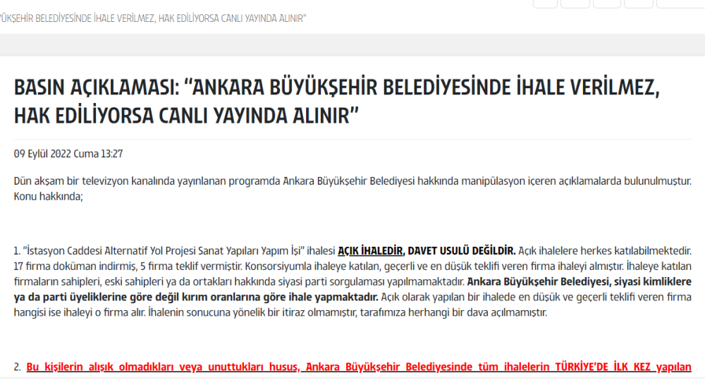 1. “İstasyon Caddesi Alternatif Yol Projesi Sanat Yapıları Yapım İşi” ihalesi AÇIK İHALEDİR, DAVET USULÜ DEĞİLDİR.Açık ihalelere herkes katılabilmektedir. 17 firma doküman indirmiş, 5 firma teklif vermiştir. Konsorsiyumla ihaleye katılan, geçerli ve en düşük teklifi verenfirma ihaleyi almıştır.İhaleye katılan firmaların sahipleri, eski sahipleri ya da ortakları hakkında siyasi parti sorgulamasıyapılmamaktadır.Ankara Büyükşehir Belediyesi, siyasi kimliklere ya da parti üyeliklerine göre değil kırım oranlarına göre ihale yapmaktadır. Açık olarak yapılan bir ihalede en düşük ve geçerli teklifi veren firma hangisi ise ihaleyi o firma alır. İhalenin sonucuna yönelik bir itiraz olmamıştır, tarafımıza herhangi bir dava açılmamıştır.