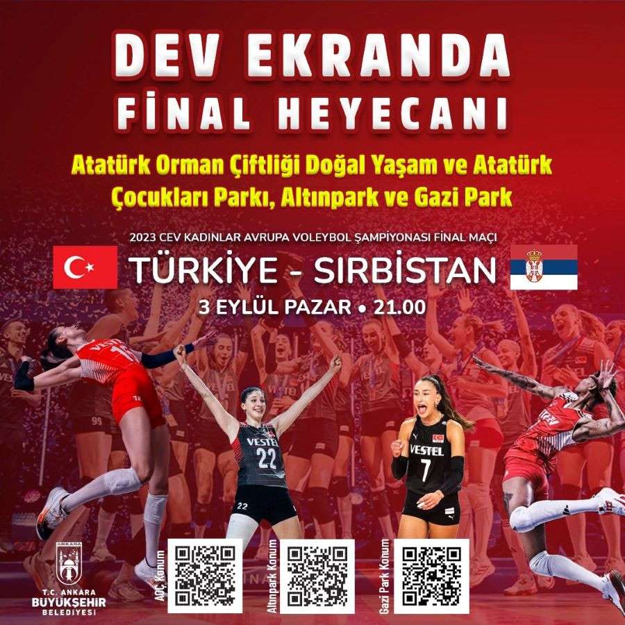 Ankara Büyükşehir Belediyesi, Filenin Sultanları’nın 2023 CEV Kadınlar Avrupa Voleybol Şampiyonası’nda oynayacağı final maçını Atatürk Orman Çiftliği Doğal Yaşam ve Atatürk Çocukları Parkı, Gazi Park ve Altınpark’a kurulacak dev ekranlardan yayınlayacak.