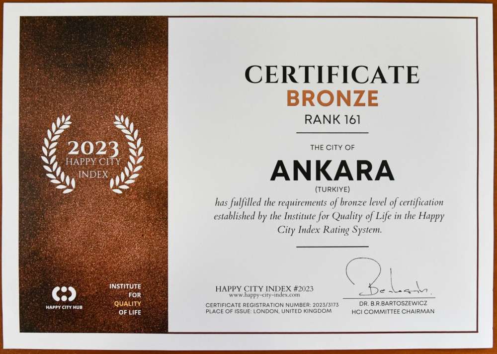 Ankara Büyükşehir Belediyesi, Başkentte hayata geçirdiği eşitlikçi ve insan odaklı projeler dolayısıyla Londra merkezli Yaşam Kalitesi Enstitüsü ve Mutlu Şehir Merkezi kurumları tarafından oluşturulan Mutlu Şehir Endeksi’nde bronz sertifika ile ödüllendirildi.