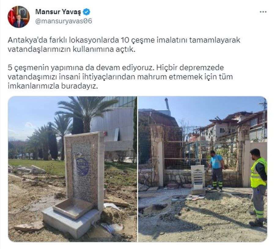ASKİ ekiplerinin gerçekleştirdiği çalışmalarla ilgili sosyal medya hesaplarından paylaşım yapan Ankara Büyükşehir Belediye Başkanı Mansur Yavaş, “Antakya'da farklı lokasyonlarda 10 çeşme imalatını tamamlayarak vatandaşlarımızın kullanımına açtık. 5 çeşmenin yapımına da devam ediyoruz. Hiçbir depremzede vatandaşımızı insani ihtiyaçlarından mahrum etmemek için tüm imkânlarımızla buradayız” ifadelerini kullandı.