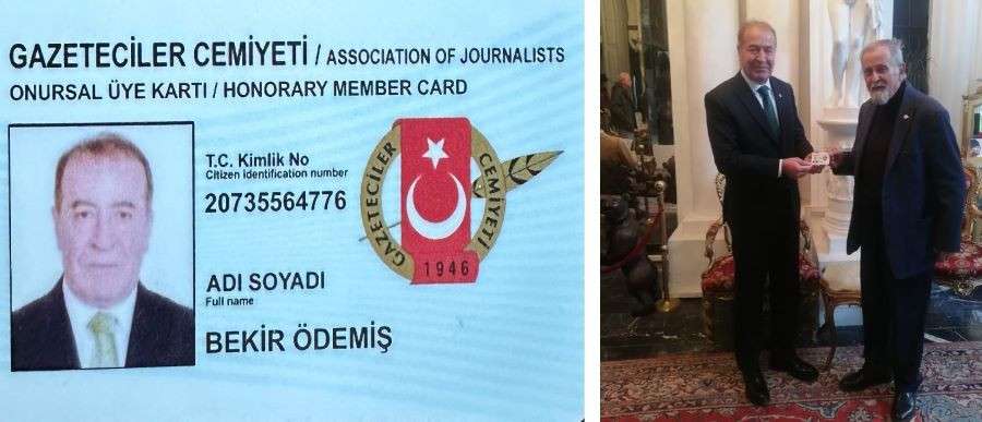 Gazeteciler Cemiyeti Yönetim Kurulu Kararı ‘onursal üye’ kabul edilen Bekir Ödemiş’e kartını Başkan Yardımcısı Savaş Kıratlı takdim etti.