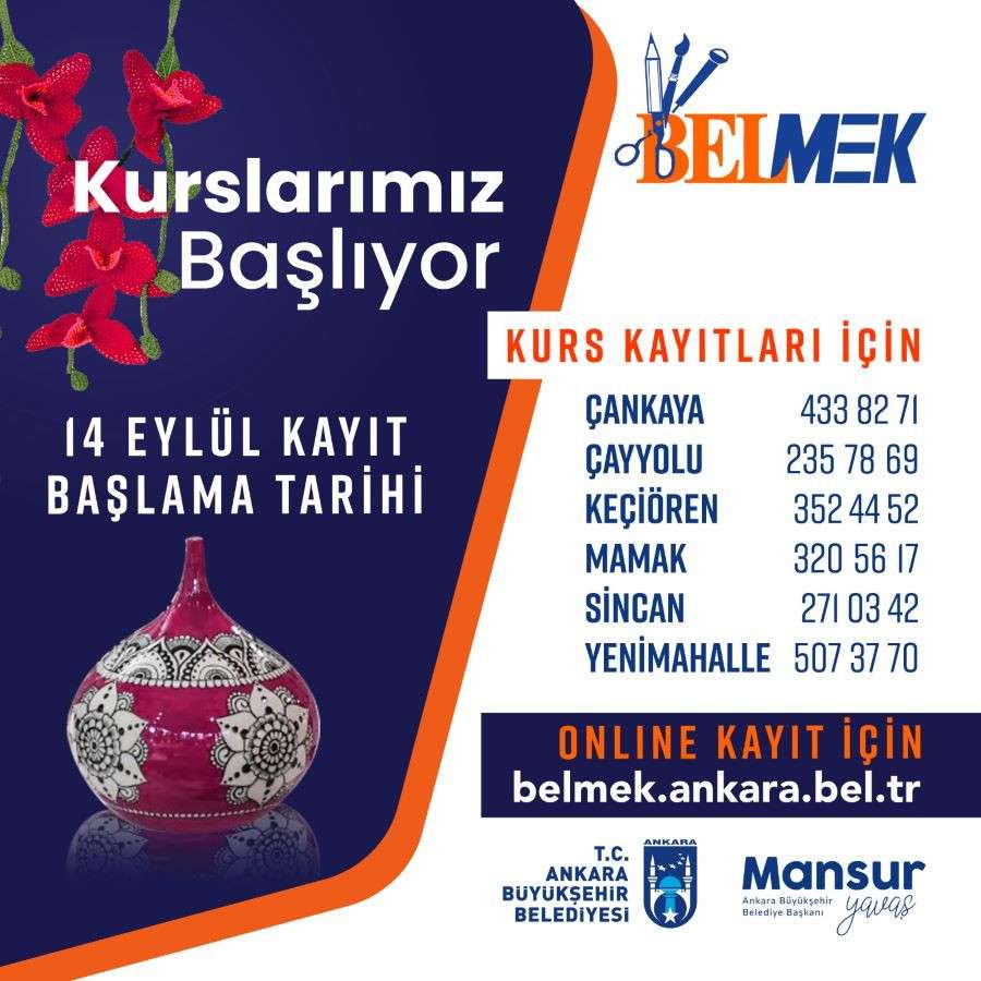 Ankara Büyükşehir Belediyesi BELMEK yeni dönem kayıtları 14 Eylül Çarşamba gününden itibaren başlıyor.2022-2023 eğitim öğretim yılında 58 kurs merkezinde 38 farklı branşta verilecek kurslara başvurular bu yıl ilk kez online olarak gerçekleştirilecek. BELMEK kurslarına kayıt olmak isteyenler, 14-21 Eylül tarihleri arasındahttps://belmek.ankara.bel.tr/adresi üzerinden online olarak başvuru yapabilecek.