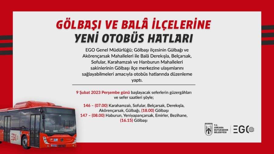 Güvenli ve konforlu ulaşım çalışmalarını sürdüren EGO Genel Müdürlüğü; Gölbaşı ve Balâ ilçe muhtarlarından gelen talepleri geri çevirmedi. Bu kapsamda 9 Şubat Perşembe günü itibarıyla; Gölbaşı ilçesinin Gülbağı ve Akörençarsak Mahalleleri ile Balâ Derekışla, Belçarsak, Sofular, Karahamzalı ve Hanburun Mahalleleri sakinlerinin Gölbaşı ilçe merkezine ulaşımları için 146 ve 147 hat numaralı iki otobüs seferi hizmete başlayacak.
