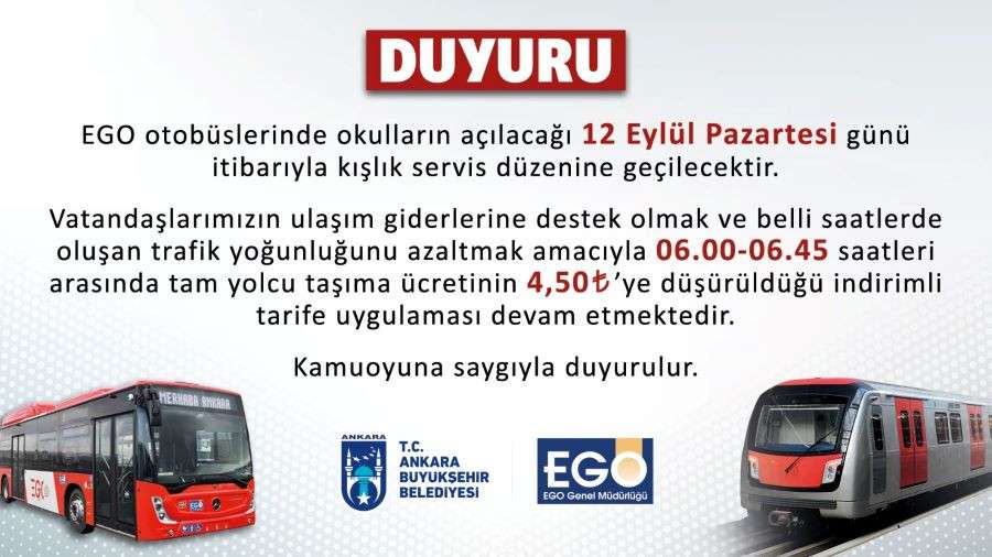 Ankara Büyükşehir Belediyesinin, özellikle çalışan vatandaşların ulaşım giderlerine destek olmak ve belli saatlerde oluşan trafik yoğunluğunu azaltmak amacıyla başlattığı sabah saatlerinde indirimli tarife uygulaması, 12 Eylül Pazartesi günü başlayacak kışlık servis programlamasında da devam edecek. 06.00-06.45 saatleri arasında EGO Genel Müdürlüğüne ait teleferik, otobüs ve raylı sistemler (Metro-ANKARAY) ile BAŞKENTRAY’da tam ücret 6,50 TL’den 4,50 TL’ye düşecek.