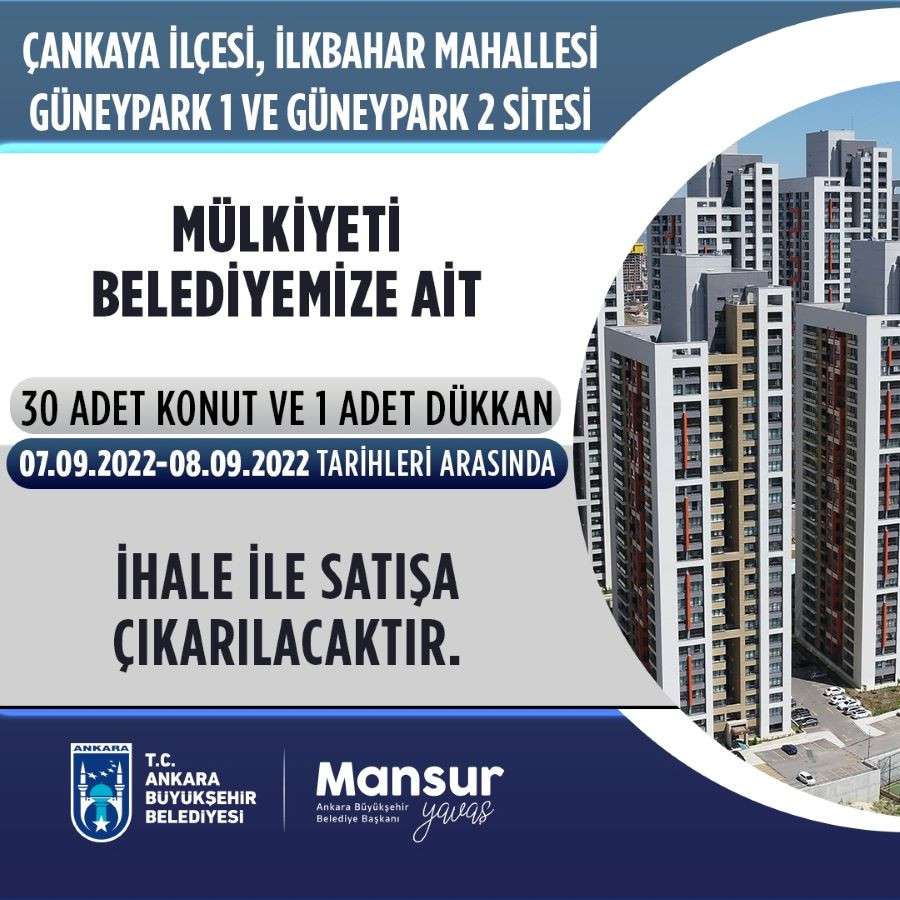 Emlak ve İstimlak Daire Başkanlığı Çankaya İlçesi İlkbahar Mahallesi Güneypark 1 ve Güneypark 2 Sitesi’nde bulunan toplam 30 konut ve 1 dükkânın satışı için 7-8 Eylül 2022 tarihleri arasında ihaleye çıkacak. İhale ile ilgili detaylı bilgiler www.ankara.bel.tr adresinde yer alırken, ihaleler Büyükşehir Belediyesi sosyal medya hesapları ile ABB TV’den de canlı olarak yayınlanacak.