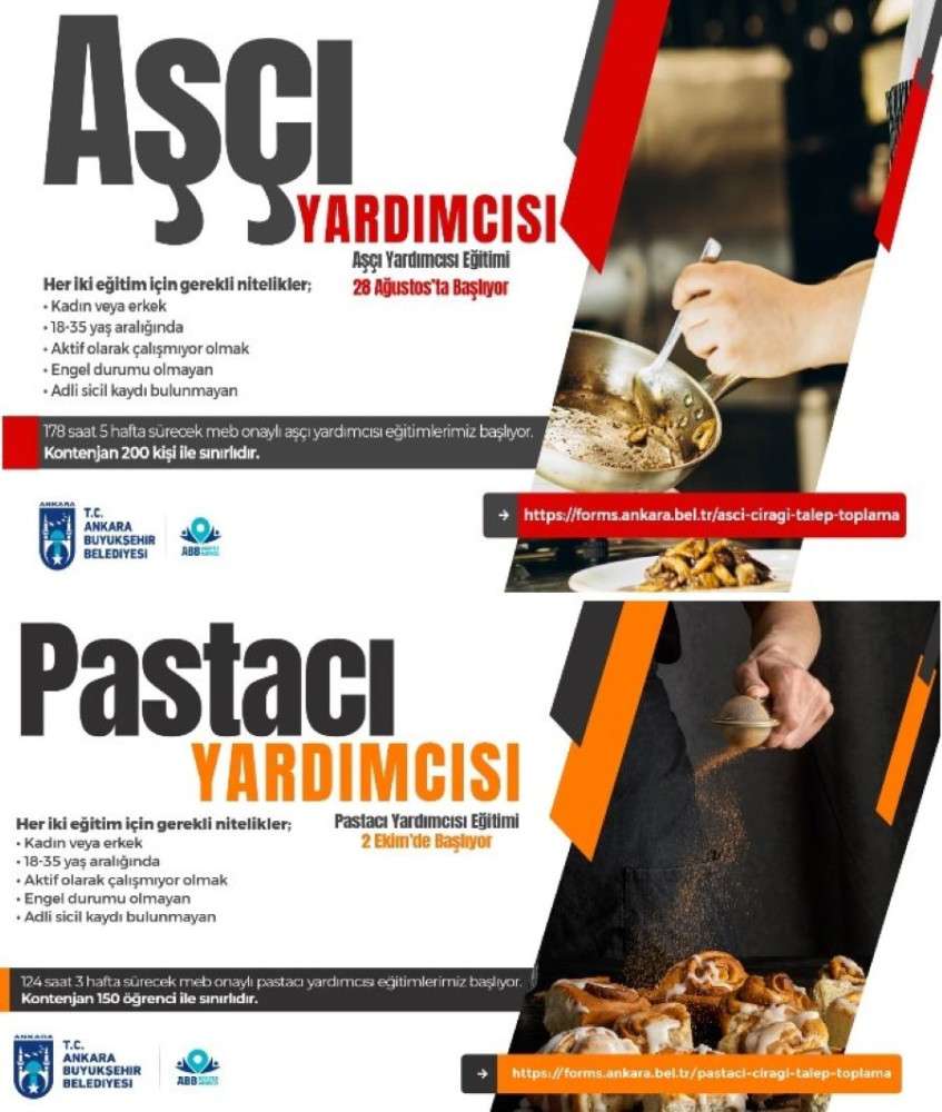 Başkentte istihdama katkı sağlaması amacıyla başlatılan eğitimlere https://forms.ankara.bel.tr/asci-ciragi-talep-toplamave https://forms.ankara.bel.tr/pastaci-ciragi-talep-toplamaadresi üzerinden online başvuru yapılabilecek. Pastacı yardımcısı eğitiminde kontenjan 150, aşçı yardımcısı eğitiminde ise kontenjan 200 kişi ile sınırlandırıldı.
