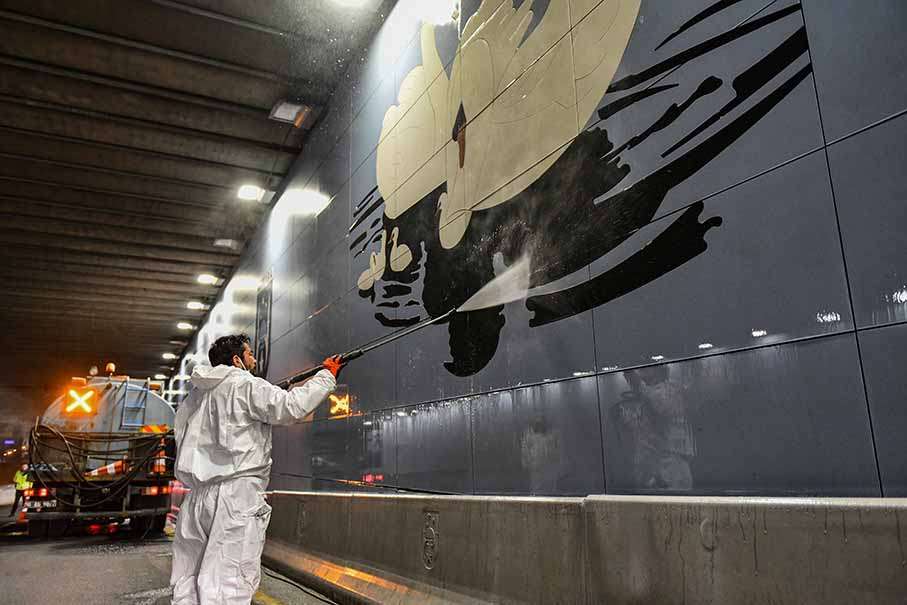 Cadde ve bulvarlarda vatandaşların yoğun olarak kullandığı otobüs durak ve çevreleri başta olmak üzere üst geçitler, bariyerler, kaldırımlar ve yollarda ayrı ayrı araçlar ve özel ekipmanlarla sürdürülen detaylı temizlik çalışmaları Kent Estetiği Daire Başkanlığı ekipleri tarafından 7/24 esasına göre yapılıyor.