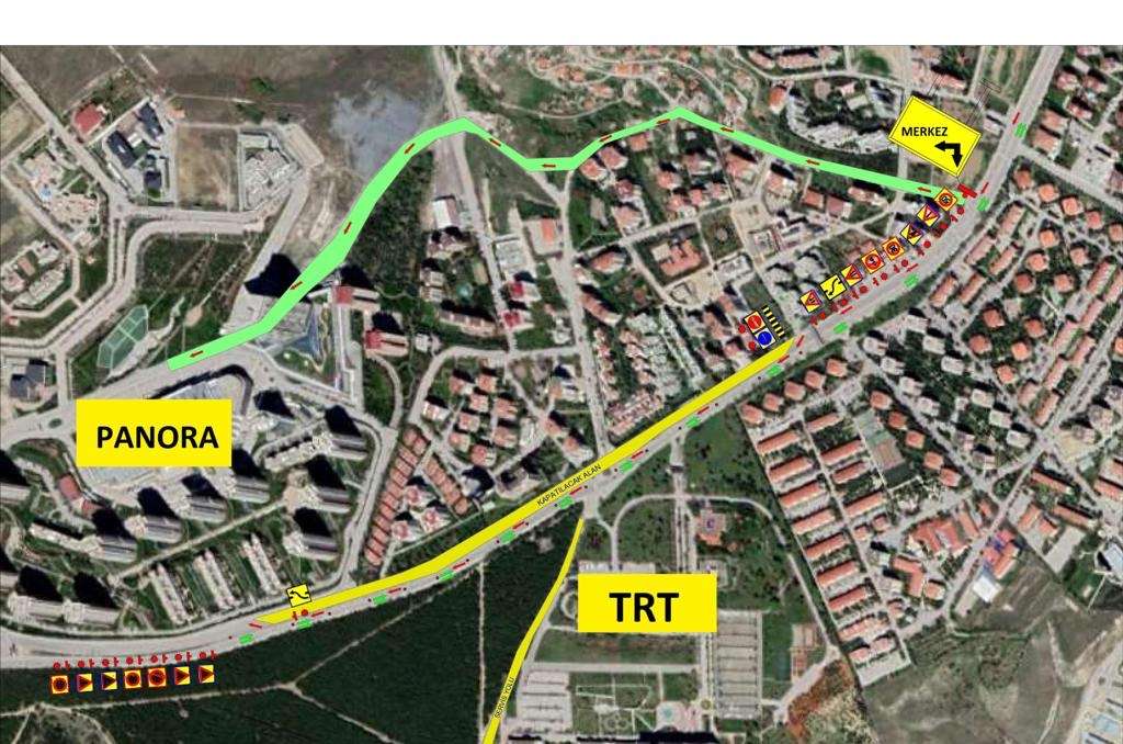 ”TRT önü köprülü kavşak çalışmaları kapsamında, 1 Nisan 2022 tarihinde (bugün) saat 22.00'den itibaren Turan Güneş Bulvarı'nda trafik akışı alternatif güzergâhlardan sağlanacaktır.