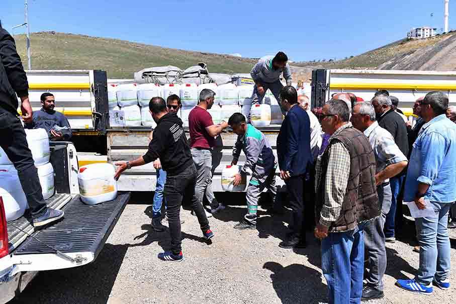 Büyükşehir Belediyesinden buğday ve arpa tohumu desteği alan çiftçiler, ekilen tahılların kardeşlenme ve sapa kalkma dönemlerinde kullanmak amacıyla Kırsal Kalkınma Daire Başkanlığı ekipleri tarafından dağıtımı gerçekleştirilen sıvı gübreye yoğun ilgi gösteriyor.