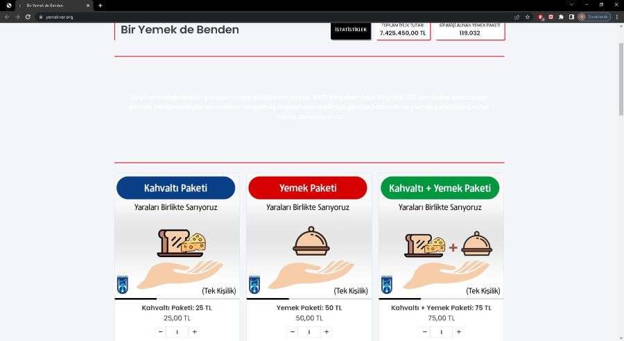 Bugüne kadar Başkent 153’ten yemek talep eden depremzede sayısı ise 25 bine yaklaşırken, kampanya kapsamında; kentlerine gelen depremzede vatandaşlara destek olmak isteyen Başkentliler, https://www.yemekver.org/ internet adresi üzerinden sipariş kahvaltı paketi 25 TL, yemek paketi 50 TL ve kahvaltı+yemek paketi 75 TL olmak üzere 3 farklı seçenekten birini satın alabiliyor. Verilen siparişler ise BelPa Mutfak’ta günlük kahvaltı ve yemek paketleri AŞTİ’ye gelen ya da Başkent 153 üzerinden başvuruda bulunan afetzede vatandaşlara ulaştırılıyor.