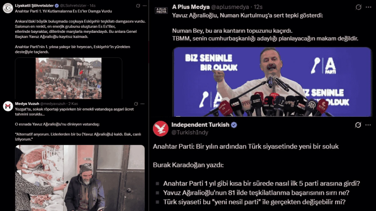 Kuruluşunun 1. yılını Ankara'da düzenlenen programla taçlandıran Anahtar Parti, sosyal medyada gündem olmaya devam ediyor. Anahtar Parti Genel Başkanı Yavuz Ağıralioğlu'nun konuşmasından kesitler pek çok sosyal medya hesabından paylaşılıyor...