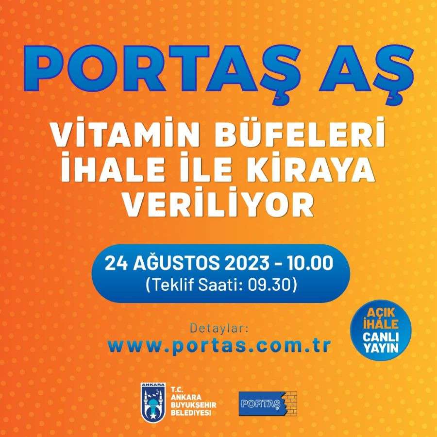 Belediye iştiraklerinden PORTAŞ AŞ;Çankaya, Keçiören ve Sincan’da bulunan vitamin büfelerini kiraya vermek için 24 Ağustos 2023 tarihinde ihaleye çıkacak.