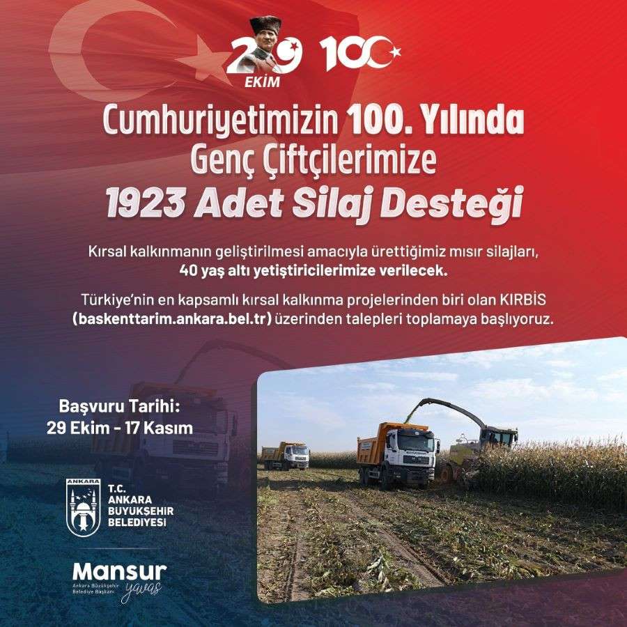 Ankara Büyükşehir Belediyesi “Cumhuriyetimizin 100’üncü yılında 1923 adet mısır silajı desteği” sloganıyla BAKAP Tarım Kampüsü ve Rekreasyon Alanı’nda yetiştirilerek paketlenen mısır silajlarını 40 yaş ve altı yetiştiricilere dağıtacak. 29 Ekim’de başlayacak başvurular, 17 Kasım’a kadar “baskenttarim.ankara.bel.tr”adresi üzerinden yapılabilecek.