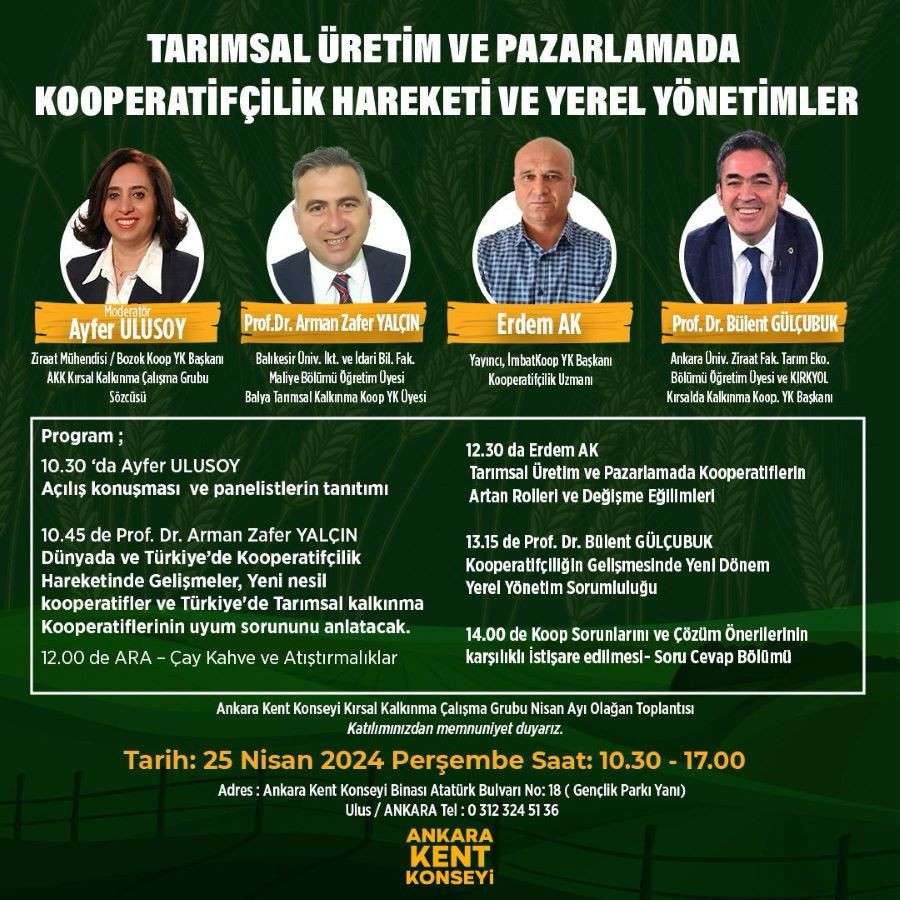 Ankara Kent Konseyi'nin Kırsal Kalkınma Çalışma grubu tarafından düzenlenen "Tarımsal Üretim ve Pazarlamada Kooperatifçilik Hareketi ve Yerel Yönetimler" konulu panel, 25 Nisan 2024 tarihinde gerçekleşecek. Panel, saat 10.30'dan itibaren Ankara Kent Konseyi binasında başlayacak ve gün boyu devam edecek.