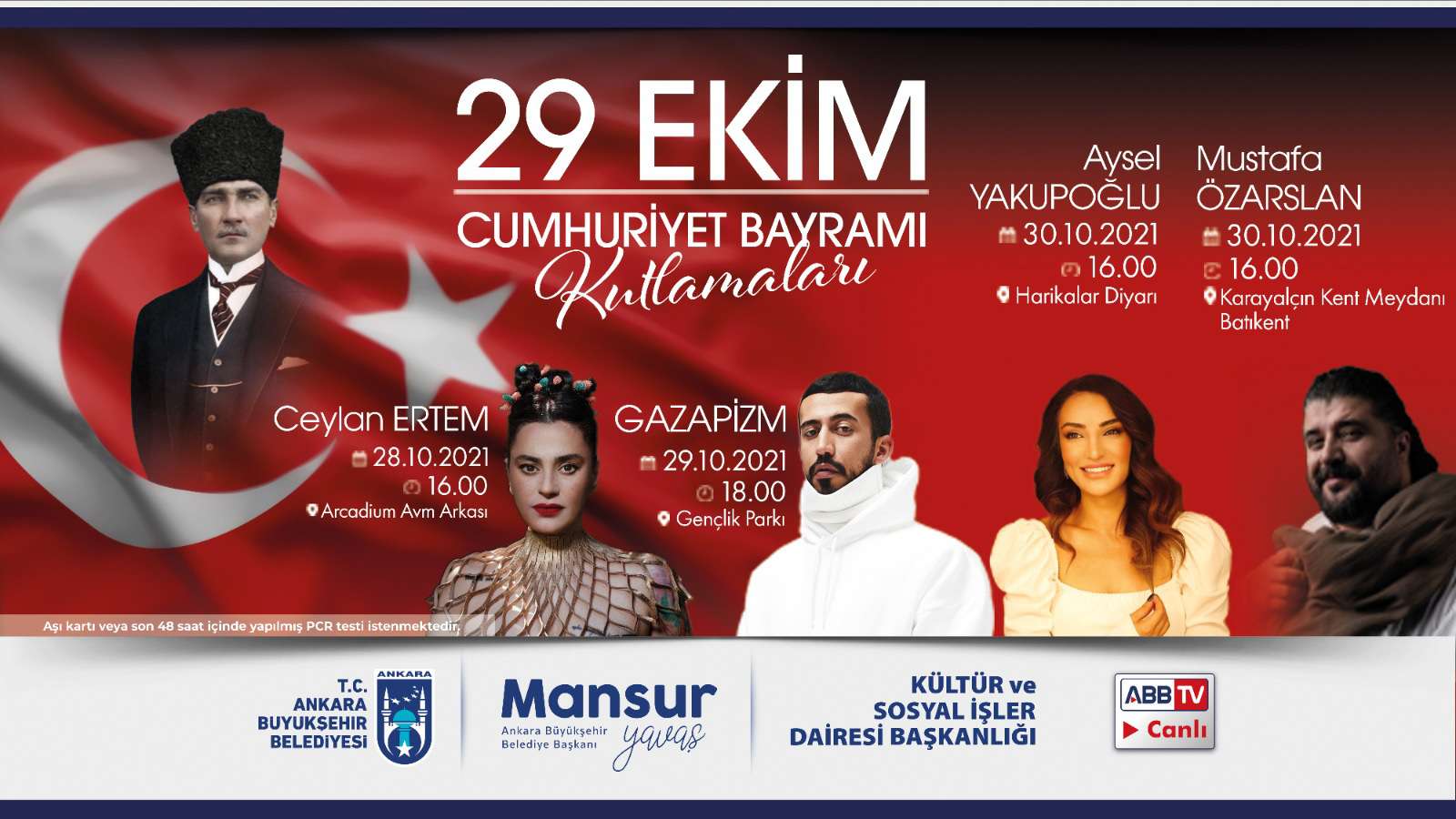 Birçok etkinliğin ABB TV’den canlı olarak yayınlanacağı Cumhuriyet Haftası, 28 Ekim Perşembe günü saat 16.00’da Arcadium AVM arkasında‘Ceylan Ertem’ konseri ile başlayacak. 28 Ekim günü saat 20.00’de Gençlik Parkı’nda ise ‘Kuvayi Milliye Destanı Oratoryosu’ konseri ile Başkentlileri buluşturacak olan Büyükşehir Belediyesi, 29 Ekim Cuma günü saat 16.00’da da Zafer Çarşısı Sanat Galerisi’nde ‘Cumhuriyet’in Zaferi Sergisi’ne ev sahipliği yapacak.