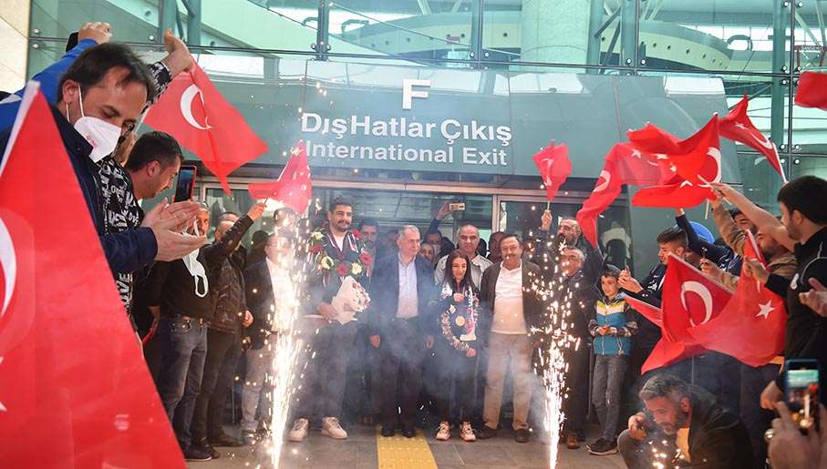 Milli güreşçiler; Esenboğa Havaalanı’nda ABB Genel Sekreter Yardımcısı Baki Kerimoğlu, ASKİ Spor Kulübü Başkanı Yüksel Aslan, Gençlik ve Spor Hizmetleri Daire Başkanı Mustafa Artunç, Kulüp yöneticileri, antrenörler, 300 çocuk projesindeki çocuklar ve çalışma arkadaşları tarafından Türk bayrakları ve konfetilerle karşılandı.