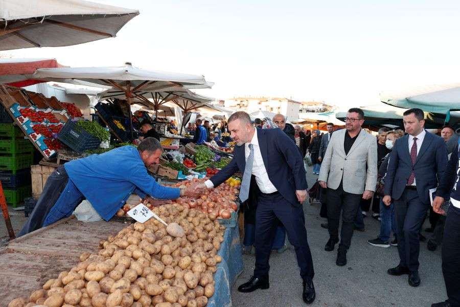 Başkan Ercan, Pazar tezgâhlarını dolaşarak Pazar esnafıyla tek tek tokalaştı; esnafın talep ve önerilerini yerinde dinledi.