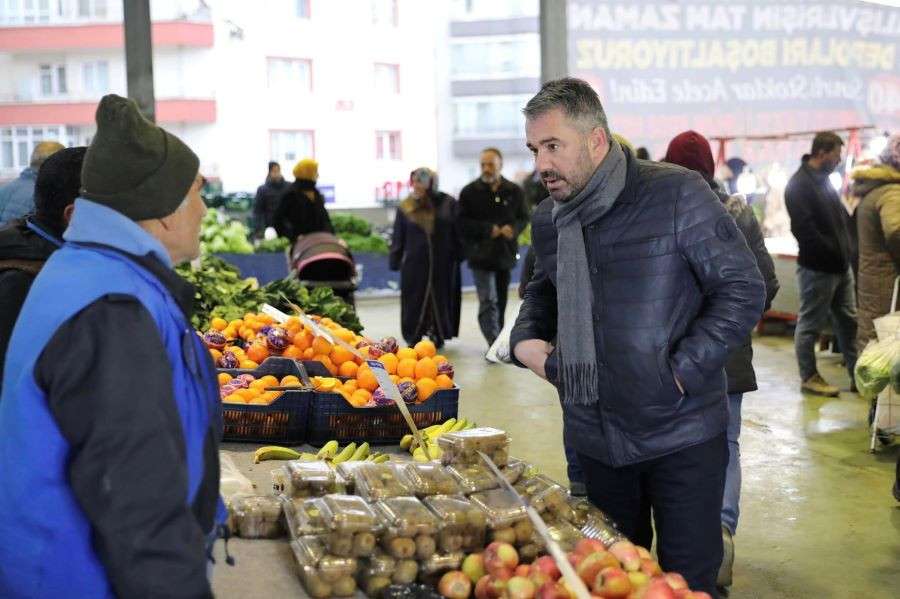 Pazar alanında genç, yaşlı herkesin yoğun ilgisiyle karşılaşan Başkan Ertuğrul Çetin, pazar alışverişi yapmayı da ihmal etmeyerek, hem pazarcı esnafıyla hem de alışverişe gelen vatandaşlarla sohbet edip taleplerini dinledi.