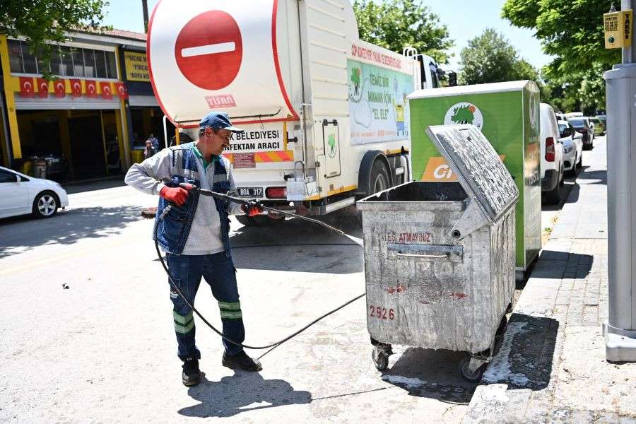 Mamak Belediyesi Temizlik İşleri Müdürlüğü, ilçe geneline yerleştirilen çöp konteynerlerini yaz döneminde oluşabilecek kötü koku ve görüntüye karşı temizledi.