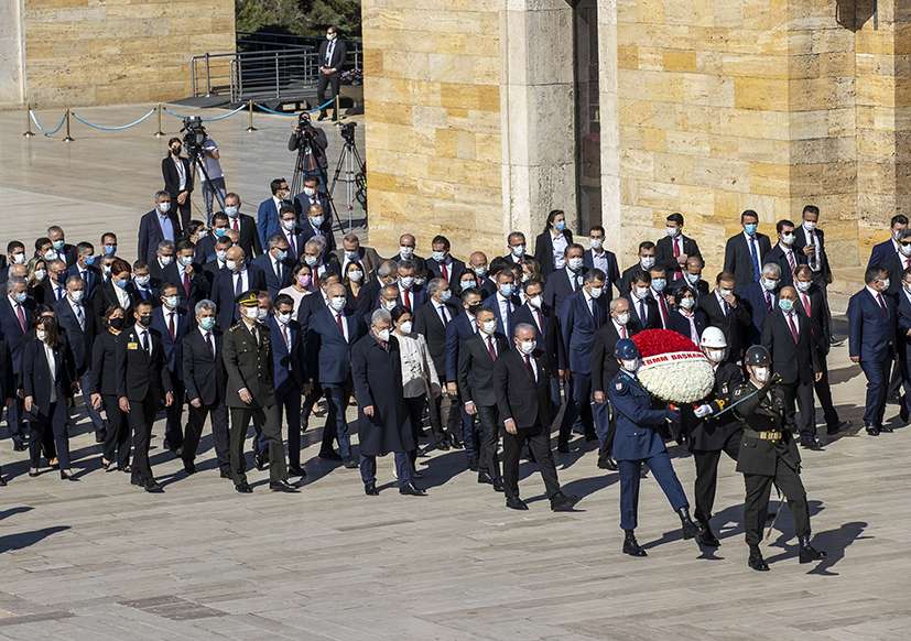 Heyettekiler maske takarken Aslanlı Yol'daki yürüyüş, mozoleye çelenk bırakılması ve Anıtkabir Özel Defteri'nin imzalanması sırasında sosyal mesafe korundu.