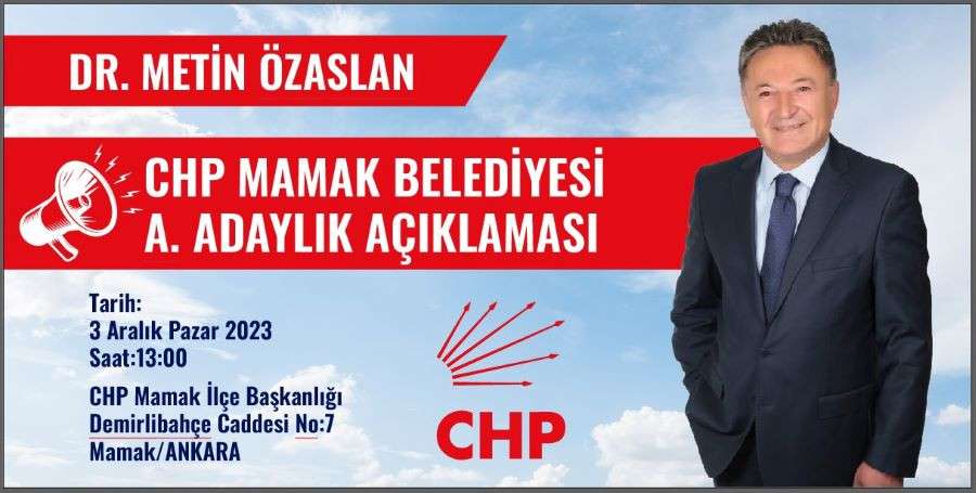 CHP’den Mamak Belediye Başkan Aday Adaylığını CHP Mamak İlçe Başkanlığında geniş katılımlı bir törenle Saat 13.00’te açıklayacak olan Dr. Metin Özaslan, tüm dostlarını ve partilileri davet etti.