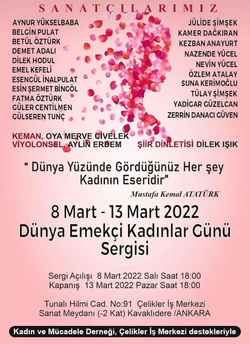 Kadın ve Mücadele Derneği ile Çelikler İş Merkezi'nin destekleriyle düzenlenen, Ankaralı 20 kadın sanatçının katılacağı ''Dünya Emekçi Kadınlar Günü'' sergisi 8 Mart Salı günü saat 18.00'de Tunalı Hilmi Caddesi Çelikler İş Merkezi Sanat Meydanı'nda açılıyor.