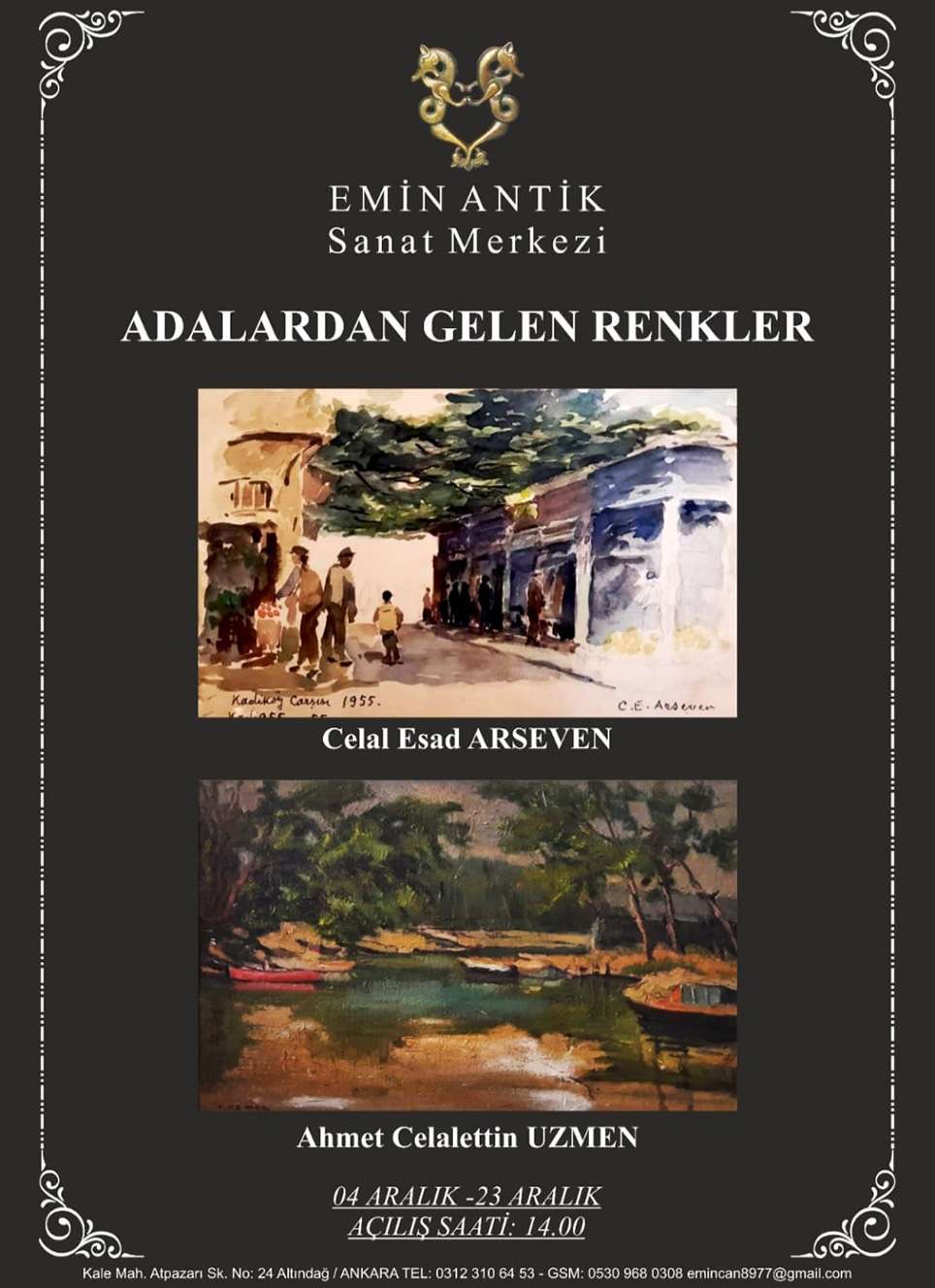 Başkent Ankara’nın kültür / sanat merkezi haline gelen Kale’deki faaliyetlerin önemli adreslerinden Emin Antik Sanat Merkezi’nde “Adalardan Gelen Renkler Resim Sergisi” heyecanı yaşanıyor. Emin Antik açıklamasında tüm sanatseverler açılışa ve sergiyi ziyarete davet edildi.