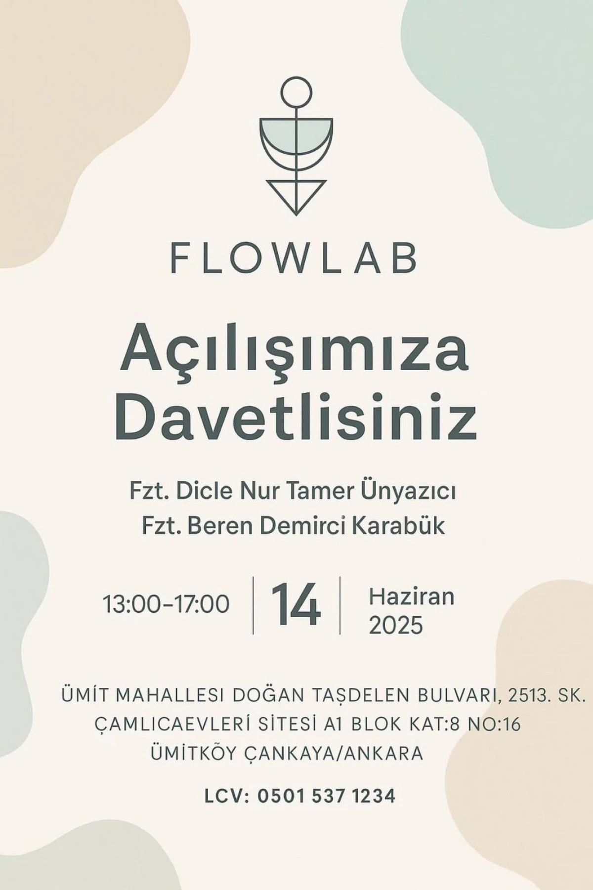 Fzt. Dicle Nur Tamer Ünyazıcı ve Fzt. Beren Demirci Karabük tarafından kurulan Flowlab, Ankara Ümitköy’deki yeni merkezinin açılışını 14 Haziran 2025 tarihinde gerçekleştirecek. Açılış saat 13.00’te başlayıp 17.00’ye kadar sürecek.