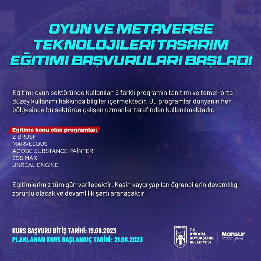 Ankara Büyükşehir Belediyesinin "Oyun ve Metaverse Teknolojileri Tasarım Eğitimi" yeniden başlıyor. Eğitime katılmak isteyen vatandaşlar; 19 Ağustos Cumartesi gününe kadar başvuru yapabilecek.
