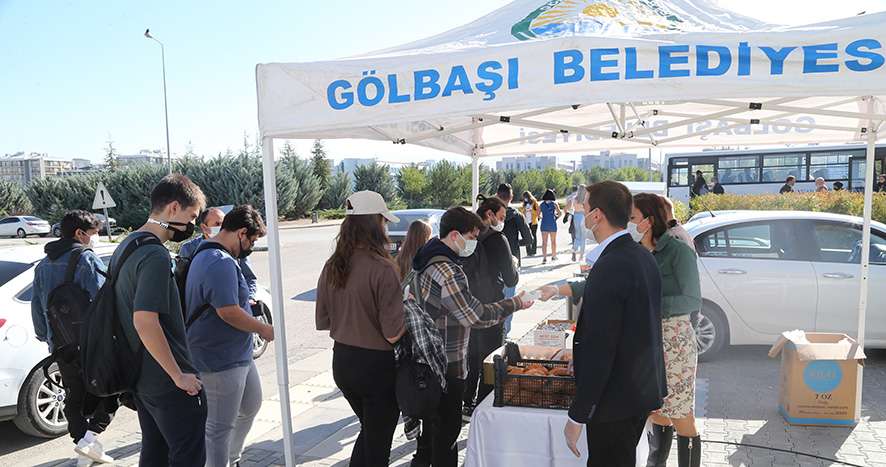 Gölbaşı Belediyesi yeni eğitim dönemi sebebiyle üniversite öğrencilerine sabahın erken saatlerinde poğaça ve çay ikramında bulundu.