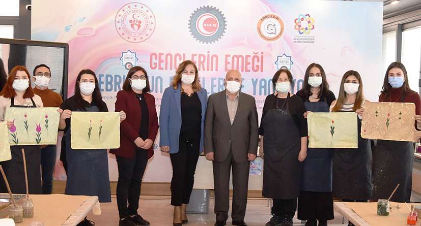 Hak-İş Genel Başkanı Mahmut Arslan, konfederasyonun "Gençlerin Emeği Ebru'nun Renklerine Yansıyor Projesi" kapsamında eğitimini tamamlayan kursiyerlere sertifikalarını verdi.