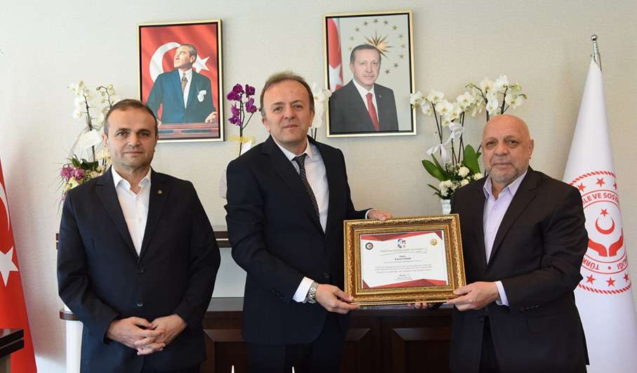 Arslan, Aile ve Sosyal Hizmetler Bakan Yardımcısı Rıdvan Duran’a HAK-İŞ tarafından Konya Ağaçlandırma alanına, adına yapılan fidan bağışı sertifikasını takdim etti.