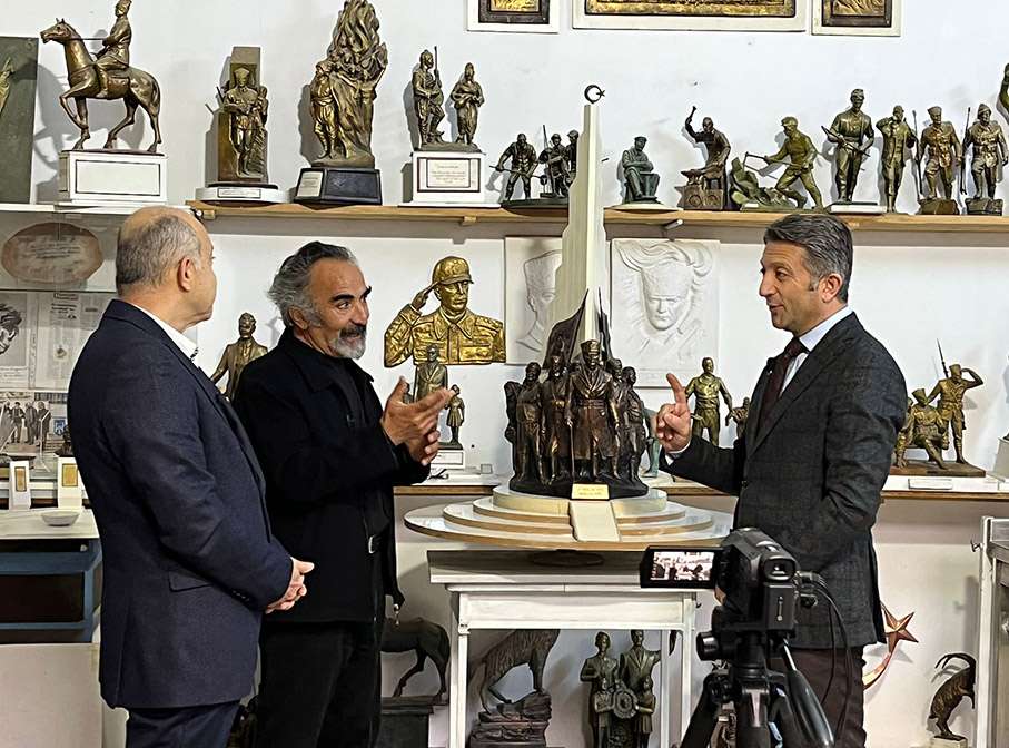 Kızılcagün TV’de Akademisyen Yazar Dr. Necati Yalçın ve Ankara İl Kültür ve Turizm Müdürü Ali Ayvazoğlu ile beraber Heykeltıraş Aslan Başpınar atölyesindeyiz. Ankaramıza anlam ve değer katan sanatçılarımızdan Aslan Başpınar sanat camiası tarafından "Sanattan ışık yontup kendi karanlığını aydınlatan adam" şeklinde tanımlanıyor. Yozgat'ta İlkokul 1. Sınıftayken incelediği Atatürk Büstü ve kili keşfetmesiyle başlayan sanat yolculuğu, ilkokul sonrasında köyünün tarım aletlerinin yapımında ve el işlerinde ustalaşan dedesiyle babasını gözleyerek becerisini geliştirmesiyle devam ediyor. Sanat yaşamında 50 yılı deviren Heykeltıraş Aslan Başpınar, 1996 yılında kendi heykel atölyesi olan Aslan Başpınar Heykel ve Tasarım Atölyesini kurdu. Öyle bir atölye ki içinde çok sayıda Atatürk heykeli, rölyef örnekleri ve yapılması planlanan projeleri mevcut. Atölyeye girerken çatıda vefa ve minnet borcunu ödemek istediği babası Veli Başpınar'ın heykeli misafirleri selamlıyor. Memleketi Yozgat'ta Atatürk Anıtı ve Nida Tüfekçi anıtları gibi eserleri bulunan Başpınar'ın eserleri Ankara'da aslında her gün karşımıza çıkıyor. Bunlardan bazıları Atatürk'ün Ankara'ya gelişinin 101. yılında Genelkurmay kavşağında açılan 27 Aralık 1919 Kızılcagün Anıtı, Nazım Hikmet Kültür Merkezi'nde yer alan Nazım Hikmet ve Atatürk heykelleri, Batıkent'te Aşık Mahzuni Şerif heykeli, Çankaya Parkı'nda Uğur Mumcu heykeli, Sakarya Savaşının sembol yerlerinden olan Malıköy Tren İstasyonunda yer alan heykellerin bir çoğu ilk akla gelenler. Kızılcagün Anıtı incelendiğinde kalpağı ile Mustafa Kemal Paşa adeta “Güneş doğudan yükselir” mesajı vererek, doğu yönüne doğru bakmaktadır. Paşa’nın sol yanında Ankara Valisi Yahya Galip, sağ tarafında ise Ankara Müftüsü Börekçizade Rifat Efendi yer alır. Her ikisinin arkasında, Ankara eşrafından kişiler, Seymenler, Bacıerenler, gençler ve çocuklar bulunur. Anıtın batı cephesinde ise, atlı Seymenlerin yer aldığı rölyefin önünde, davul eşliğinde zeybek oynayan Seymen vardır. Kızılcagün Anıtı, 27 Aralık 1919’u yani Kızılcagün atmosferini muhteşem bir şekilde gözler önüne serer. Zaten Ankara'da nerede bir Atatürk heykeli görsek birçoğunun gizli kahramanı olan Heykeltıraş Aslan Başpınar "Anıtları, Tarih tasarlar" düşüncesine işte bu yüzden sahiptir.