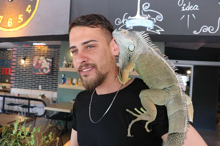 Kafe işletmecisi müşterilerini omzunda iguana ile karşılıyor