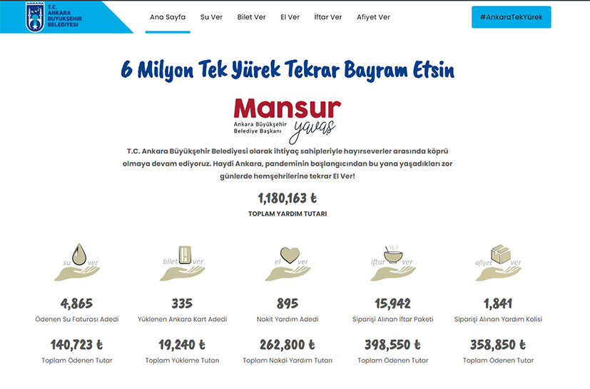 “www. ankaratekyurek.com” adresi üzerinden anlık olarak açıklanan verilere göre; 2 Nisan 2021 tarihi itibarıyla toplam yardım tutarı 1 milyon 187 bin 842 TL’ye ulaştı. Hayırsever vatandaşlar; Su faturası, ANKARAKART yükleme, Nakit yardımı, İftar Paketi ve Yardım kolisi seçeneği ile sadece Ankara’dan değil diğer illerden ve yurt dışından da kampanyaya yoğun ilgi gösterdi. İlk 24 saatte; “Su Ver” ile 142 bin 590 TL’lik 4 bin 908 adet su faturası ödenirken, “Bilet Ver” ile 19 bin 402 TL’lik 337 ANKARAKART’a yükleme yapıldı. “El Ver” ile 900 adet nakit yardımıyla toplam 263 bin 900 TL yardım toplanırken, “İftar Ver” ile 16 bin iftar paketi sipariş edilerek, 400 bin 250 TL’lik yardım oranına ulaşıldı. “Afiyet Ver” ile de 361 bin 700 TL’lik bin 858 adet yardım kolisi desteği sağlandı.