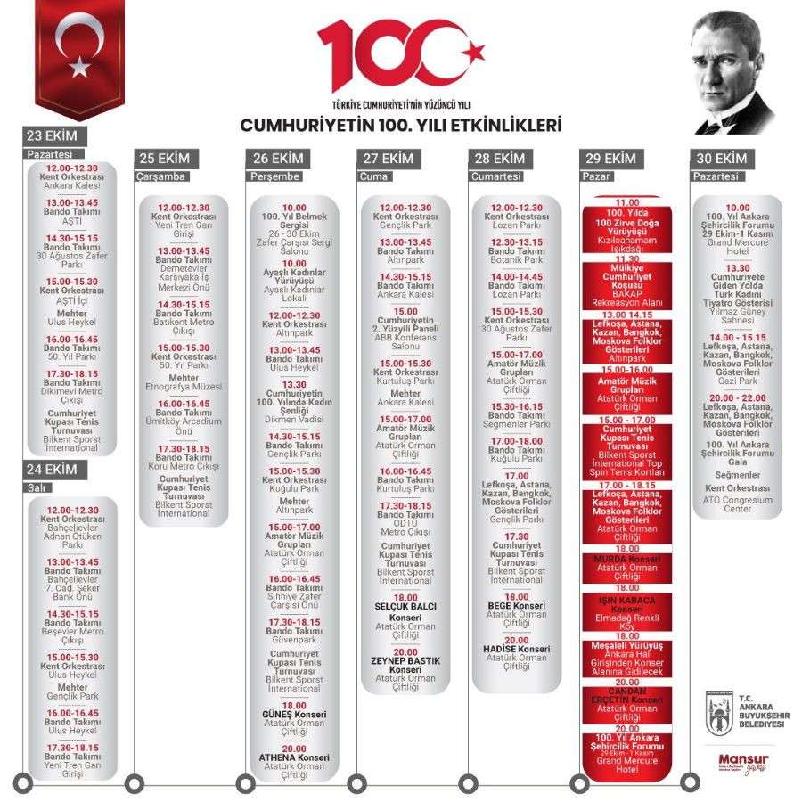 Cumhuriyet Haftası etkinlik takvimini sosyal medya hesaplarından paylaşan Ankara Büyükşehir Belediye Başkanı Mansur Yavaş, “Cumhuriyetin Başkentine böyle bir program yakışırdı. Günlerdir devam eden etkinliklerimizin son hafta programında Ankara, 100. yıl coşkusuyla kırmızı beyaz olacak. Forumlar, sergiler, meşaleli yürüyüşler; spor, müzik, dans, tiyatro ve folklor gösterileri, konserler ve sürpriz etkinlikler… Tüm hemşehrilerimi etkinliklerimize davet ediyorum” ifadelerini kullandı.