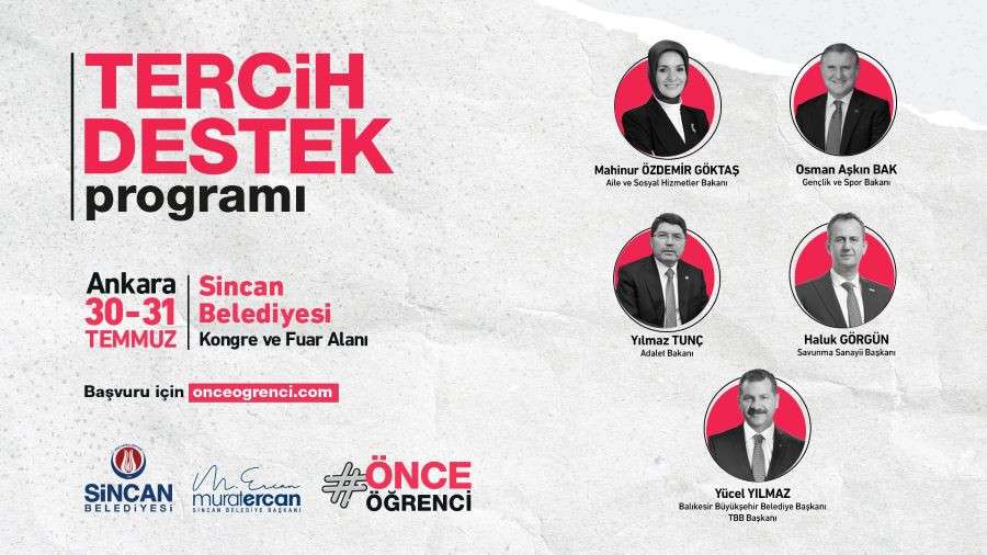 Üniversite adaylarının heyecanla beklediği YKS sonuçlarının açıklanmasıyla tercih süreci başladı. Önce Öğrenci platformu tarafından düzenlenen Tercih Destek Programı'nın Ankara ayağı Sincan’da 30-31 Temmuz tarihlerinde gerçekleşecek. Sincan Belediyesi Kongre ve Fuar Alanı’nda düzenlenecek programda uzmanlar ve alanında başarılı isimler öğrencilere deneyimlerini aktaracak. Başvurular ise https://onceogrenci.com/ adresinden yapılacak.