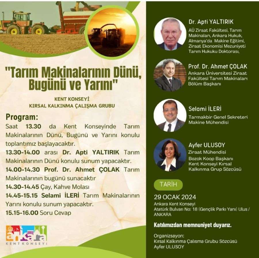 Ankara Kent Konseyi, tarım makinaları konulu bu etkinlikle katılımcılara, tarım sektörünün gelecekteki dinamikleri hakkında bilgi ve deneyim paylaşımı fırsatı sunmayı amaçlıyor.
