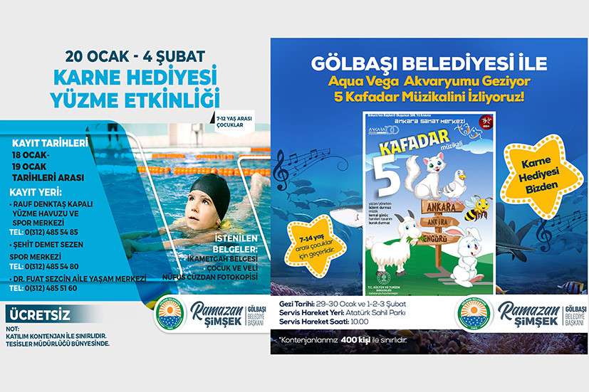 Öğrencilerin tatil döneminde eğlenceli vakit geçirmelerini sağlamak amacıyla planlanan etkinliklerde, çocuklar hem eğlenecek hem de öğrenecek. Bu kapsamda Gölbaşı Belediyesi, 29-30 Ocak ve 1-2-3 Şubat tarihlerinde 400 öğrenciyi Aqua Vega Akvaryumu'nu ziyaret etmeye götürecek. Belirlenen tarihlerde saat 10.00'da Atatürk Sahil Parkı'ndan kalkacak olan servislerle öğrenciler, eğlenceli bir akvaryum gezisi yapacaklar. Ayrıca, aynı günlerde Ankara Sanat Merkezi tarafından sergilenen '5 Kafadar' adlı müzikali izleme fırsatı bulacaklar.