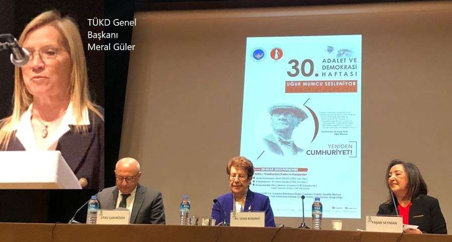 TÜKD Genel Başkanı Meral Güler, “Bizler, katiller, katilleri azmettiren o zihniyet, katillere çanak tutan diğer kişilerle aynı gökyüzü altında, aynı kara parçası üstünde yaşıyoruz. Gün içinde aynı yollardan yürüyor, temel ihtiyaçlarımız için aynı yerlerden alışveriş yapıyoruz. Yüreğe ağır gelen bu durum bizi kendi haklarımızı sorgulamaya, adaleti aramaya itiyor. Değerli Dostlar, adaleti aramak asla bireysel bir çaba olamaz, olmamalıdır. Adalet, hukukun üstünlüğü ile bizlerin yolunu aydınlatmalıdır. Adalet, bazı çevrelerin kendi çıkarlarına göre altını boşalttığı, çeşitli manevralarla farklı anlamlar kattığı bir kelime değildir.” Dediği konuşmasında şu görüşlere yer verdi: