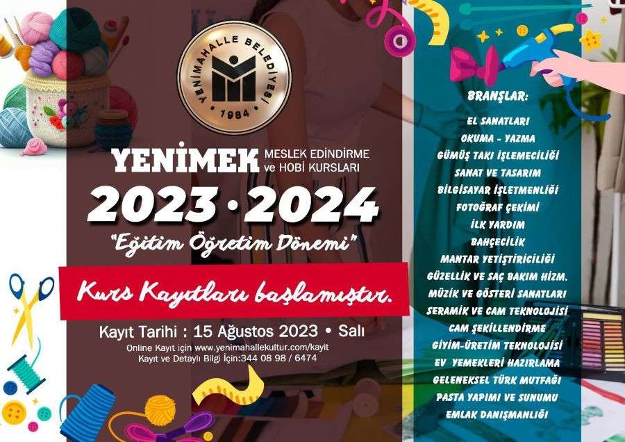 Yenimahalle Belediyesi Meslek Edindirme ve Hobi Kursları’nda (YENİMEK) 2023-2024 eğitim öğretim dönemi için kayıtlar başladı. İlçe sakinlerinin talep ve ilgisi ile branş sayısını günden güne arttıran YENİMEK yeni dönem kurs kayıtlarına vatandaşlar her yıl olduğu gibi bu yılda büyük ilgi gösteriyor.