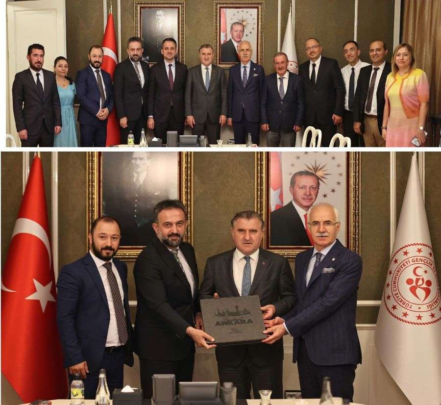 ATO Yönetim Kurulu Başkan Yardımcıları Halil İbrahim Yılmaz ve Temel Aktay, ATO 58 No’lu Oteller ve Konaklama Tesisleri Meslek Komitesi Başkan Yardımcısı ve aynı zamanda Anadolu Özel Yurtlar Derneği Başkanı Ömer Özkan Özdemir, 58 No’lu Komite Üyesi Gülay Kılıç, Anadolu Özel Yurtlar Derneği Başkan Yardımcıları Fatih Yalçınkaya ve İlker Aktürk, Dernek Genel Sekreteri Alkan Kan, Sayman Üyesi Kerem İçöz ve ATO İdea Genel Müdürü Gaye Yardımcı’dan oluşan ATO Heyeti, Gençlik ve Spor Bakanı Osman Aşkın Bak’ı makamında ziyaret etti.