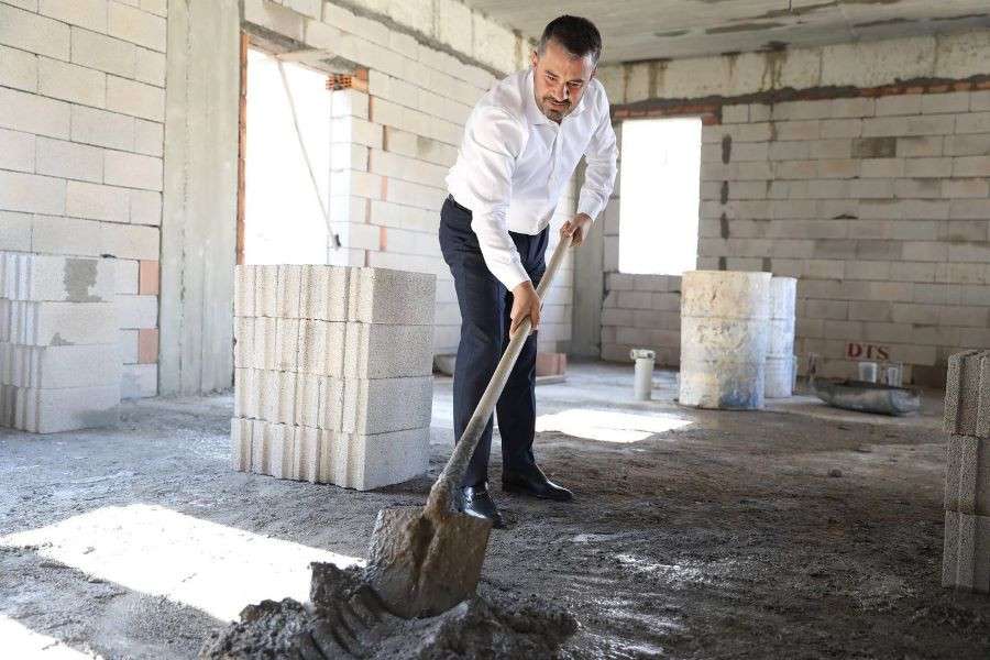 İlçeye eğitim ve kültürel açıdan değer katacak projeleri bir bir hayata geçiren Başkan Ertuğrul Çetin, sorumlu Başkan Yardımcısı Hamdi Kesgin ve birim müdürleri ile inşaat alanlarını tek tek gezerken, çalışma arkadaşlarına yardım edip harç karıştırdı.