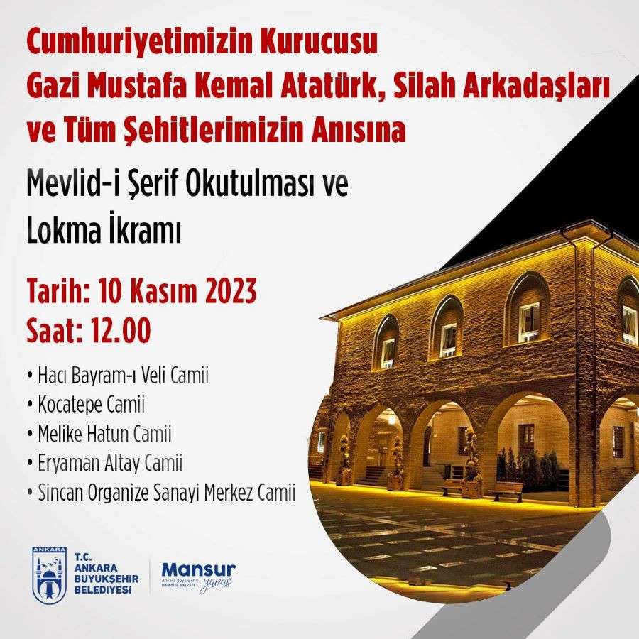 Ankara Büyükşehir Belediyesi, 10 Kasım 2023 günü Cumhuriyetimizin kurucusu Gazi Mustafa Kemal Atatürk ve aziz şehitlerin anısına merkez ilçelerdeki camilerde Mevlid-i Şerif okutup lokma dağıtacak.