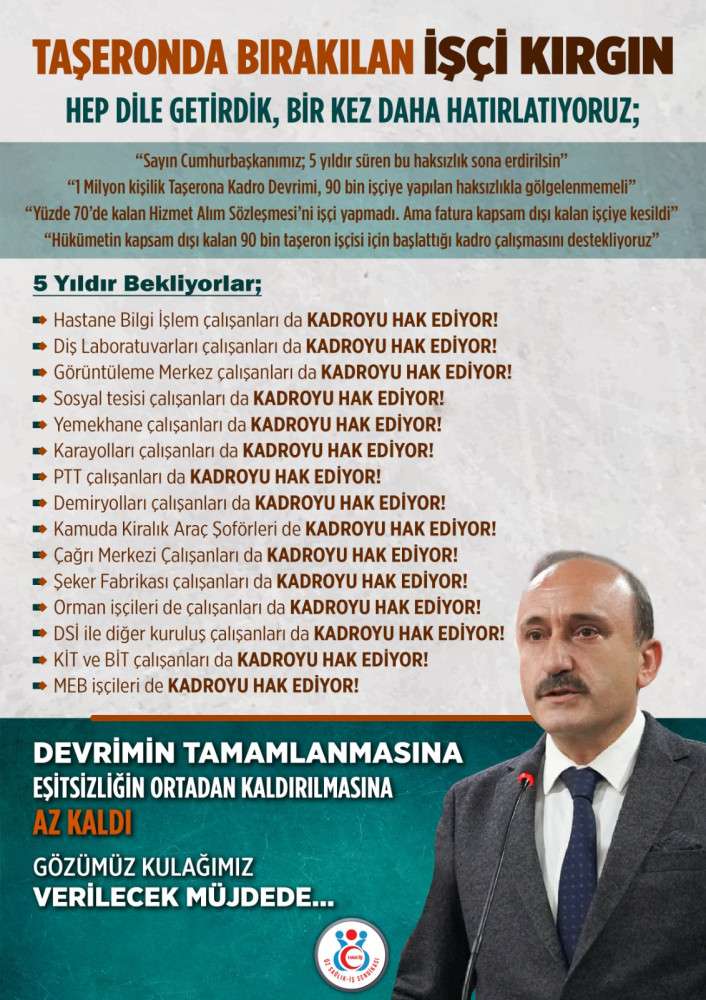 Genel Başkan Devlet Sert, “Hep Dile Getirdik, Bir Kez Daha Hatırlatıyoruz” diye başlayan talep açıklamasında şu ifadeleri kullandı: -Sayın Cumhurbaşkanımız; 5 yıldır süren bu haksızlık sona erdirilsin. -1 Milyon kişilik Taşerona Kadro Devrimi, 90 bin işçiye yapılan haksızlıkla gölgelenmemeli. - Yüzde 70’de kalan Hizmet Alım Sözleşmelerini işçi yapmadı. Ama fatura, kapsam dışı kalan işçiye kesildi. 5 yıldır bekliyorlar; Hastane Bilgi İşlem çalışanları da kadroyu hak ediyor Diş Laboratuvarları çalışanları da kadroyu hak ediyor Görüntüleme Merkez çalışanları da kadroyu hak ediyor Sosyal tesisi çalışanları da kadroyu hak ediyor Yemekhane çalışanları da kadroyu hak ediyor Karayolları çalışanları da kadroyu hak ediyor PTT çalışanları da kadroyu hak ediyor Demiryolları çalışanları da kadroyu hak ediyor Kamuda Kiralık Araç Şoförleri de kadroyu hak ediyor Çağrı Merkezi Çalışanları da kadroyu hak ediyor Şeker Fabrikası çalışanları da kadroyu hak ediyor Orman işçileri de çalışanları da kadroyu hak ediyor DSİ ile diğer kuruluş çalışanları da kadroyu hak ediyor KIT ve BİT çalışanları da kadroyu hak ediyor MEB işçileri de kadroyu hak ediyor Öz Sağlık-İş Sendikası Genel Başkanı Devlet Sert’in açıklaması şöyle sona eriyor: Devrimin tamamlanmasına, eşitsizliğin ortadan kaldırılmasına az kaldı… Gözümüz kulağımız verilecek müjdede…