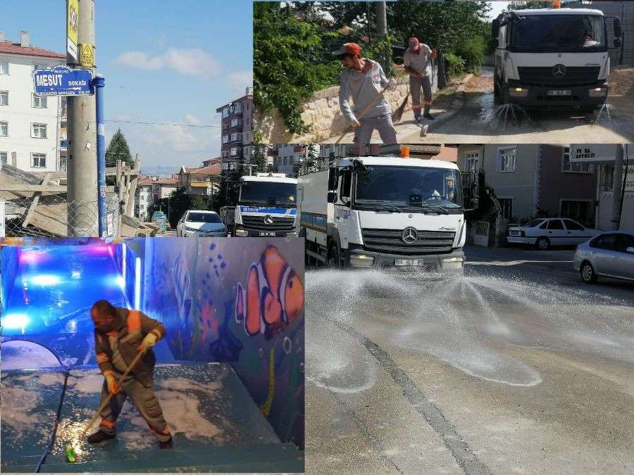 Belediye ekipleri gece gündüz tüm mahallelerde mıntıka temizliği yapıyor. Yeşil alan ve parklarda da günlük olarak temizlik çalışmaları özenle yürütülüyor. Çöp konteynerleri de bulaşıcı hastalıkların ve etrafa yayılacak kötü kokunun önüne geçilmesi amacıyla düzenli olarak yıkanıp dezenfekte ediliyor.