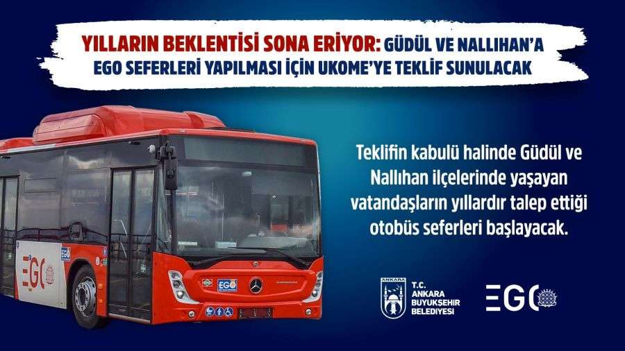 Güdül ve Nallıhan’da ikamet eden vatandaşların EGO otobüsleri ile sefer düzenlenmesi yönündeki taleplerine duyarsız kalmayan Büyükşehir Belediyesi konu ile ilgili olarak harekete geçti. EGO otobüslerinin Güdül ve Nallıhan ilçelerinde sefer yapması konusu Ulaşım Koordinasyon Merkezi Genel Kurulu’na teklif olarak götürülecek. Teklifin kabul edilmesi hâlinde Güdül ve Nallıhan’da ikamet eden vatandaşların yıllardır talep ettiği otobüs seferleri başlayacak.